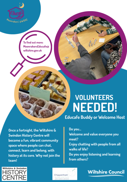 Moonrakers' Educafe will be held fortnightly from Monday 27th April at the Wiltshire & Swindon History Centre, Chippenham, where we are creating a new welcoming, friendly community space where people can chat, connect, learn and belong, with history at its core. We are looking for volunteers for a range of roles; why not find out more and join the team!